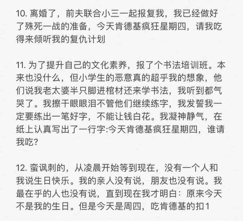 還有一種情緒營銷,抓住大家“吃瓜”或者“聽故事”的情緒。內(nèi)容前面是百態(tài)人生,最終都是一個出其不意的轉(zhuǎn)折,落腳到一個地方,讓人覺得好笑、有趣,激發(fā)傳播欲甚至創(chuàng)作欲。最經(jīng)典的莫過于肯德基的“瘋四”文學(xué)。