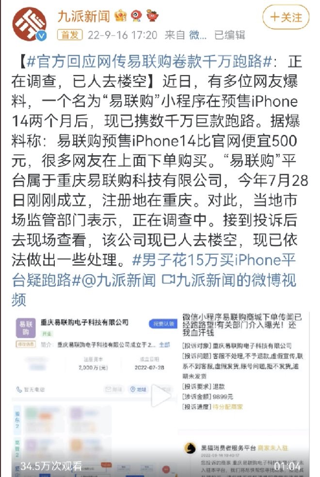 相比之下,易聯(lián)購采用了一樣的套路,又略有不同:小程序?qū)W⒃谔O果產(chǎn)品上,商城打造也模仿蘋果風(fēng)格,通過“專業(yè)性”這點(diǎn)迷惑消費(fèi)者,最初的宣傳對(duì)準(zhǔn)了黃牛和羊毛黨,隨后再通過他們觸達(dá)普通消費(fèi)者。在東窗事發(fā)后,其他平臺(tái)大多會(huì)采用安撫手段,表示貨源緊張會(huì)陸續(xù)發(fā)貨,然后慢慢撤離,而網(wǎng)傳易聯(lián)購的公告卻直接囂張表示“跑路”,也因此引發(fā)了輿論的廣泛關(guān)注。