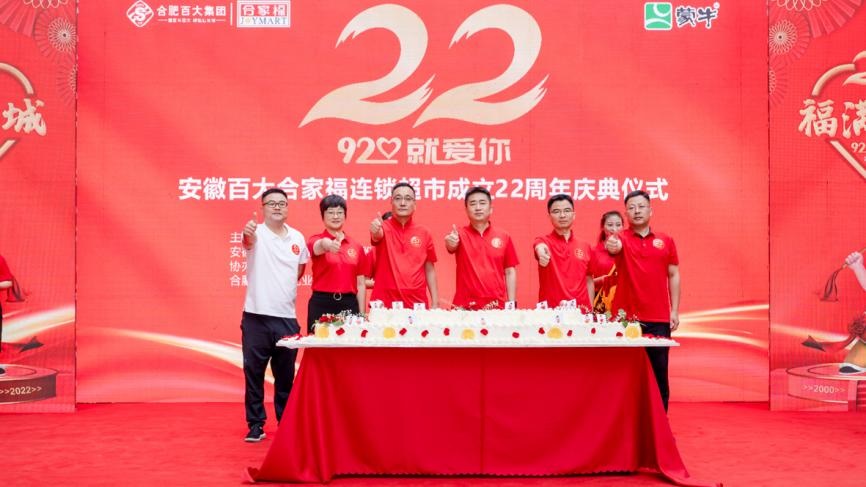 儀式尾聲,集團公司黨委書記、董事長劉浩攜與會領(lǐng)導嘉賓共同上臺,同切合家福22歲生日蛋糕,與現(xiàn)場市民及消費者同享甜蜜時刻。