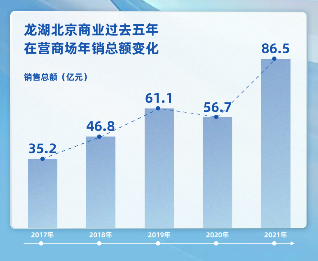 統(tǒng)計(jì)龍湖北京商業(yè)2017年至2021年五年間的銷售額后,可以發(fā)現(xiàn),除了被疫情深度影響的2020年,其在營商場的年銷售總額基本保持了相當(dāng)比率的線性增長。
