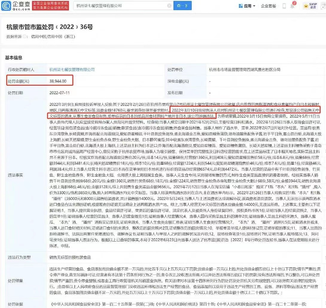 處罰事由顯示,今年3月,執(zhí)法人員接到舉報人反映,其于2022年2月26日在該餐廳就餐時,發(fā)現(xiàn)店內(nèi)推薦的兩瓶清酒和食品均產(chǎn)自日本核輻射地區(qū),并且兩瓶清酒均無中文標簽,消費金額為18760元。