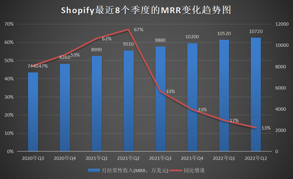 在Shopify的財(cái)報(bào)中,一個(gè)體現(xiàn)商家長期價(jià)值、關(guān)乎商家續(xù)費(fèi)情況的重要指標(biāo)——MRR(每月經(jīng)常性收入,Shopify訂閱解決方案收入的方向指標(biāo)),在2021年Q2達(dá)到近年來的最高增速(同比增長67%)后,開始明顯放緩,到今年二季度已回落至13%。