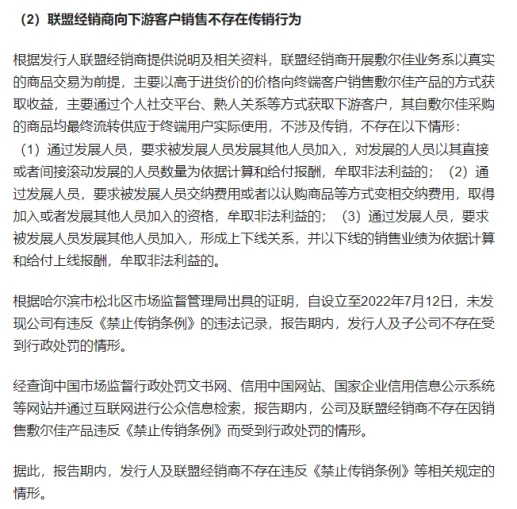 對此,敷爾佳曾明確表示,公司聯(lián)盟經(jīng)銷商向下游客戶銷售不存在傳銷行為。