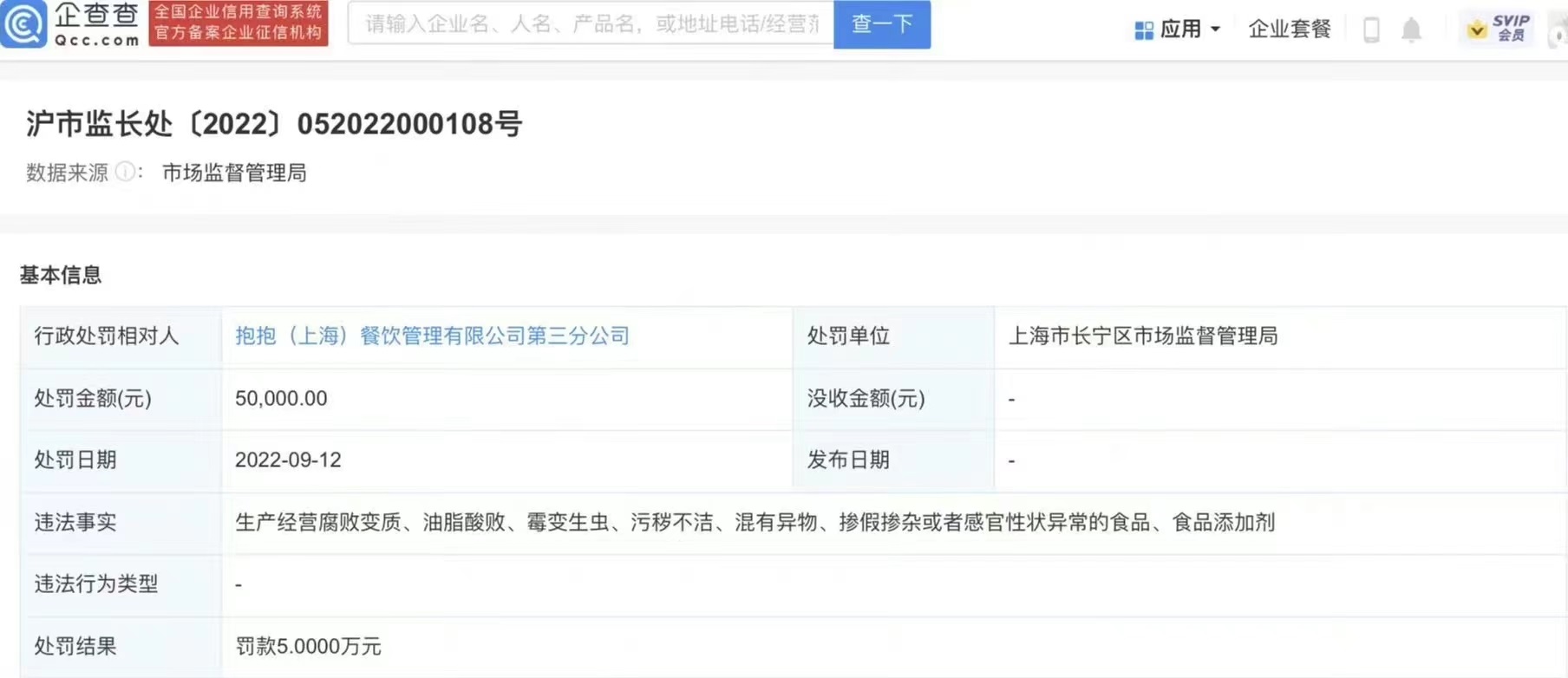 企查查APP顯示,蔡瀾港式點(diǎn)心上海分店抱抱(上海)餐飲管理有限公司第三分公司因食品安全問(wèn)題,被上海市長(zhǎng)寧區(qū)市場(chǎng)監(jiān)督管理局罰款5萬(wàn)元。