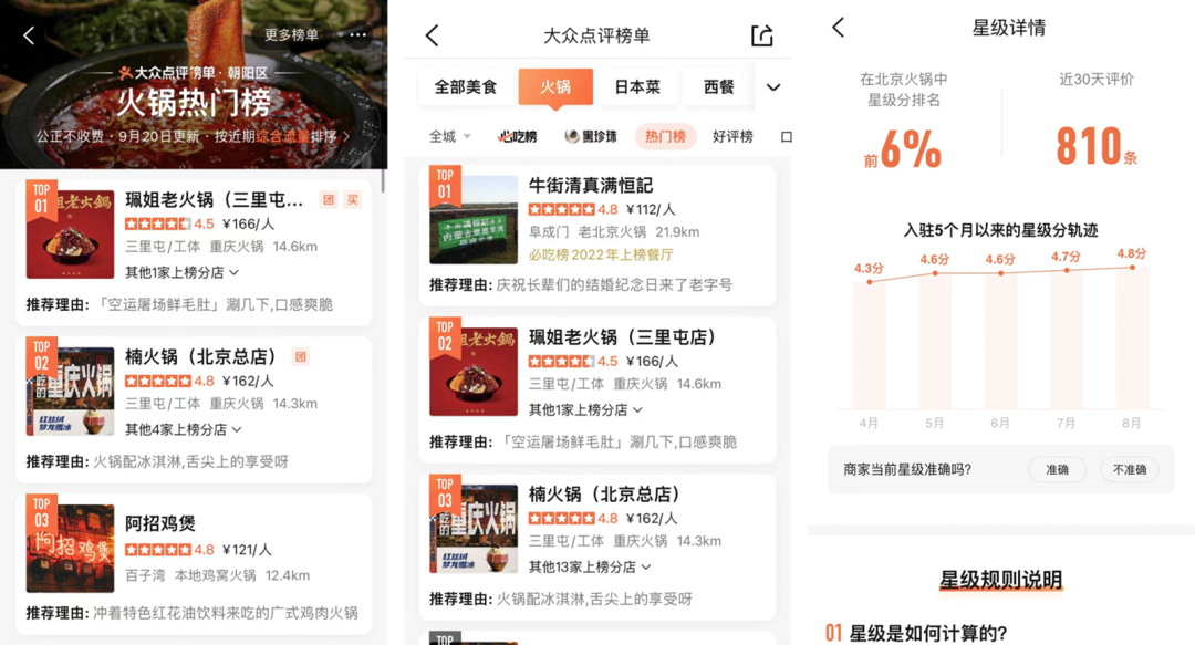 大眾點評9月20日更新的火鍋熱門榜上,楠火鍋北京總店位列朝陽區(qū)第2,全城第3,僅次于必吃榜上榜餐廳牛街清真滿恒記和剛剛開業(yè)的珮姐老火鍋。楠火鍋北京總店評分4.8分,在北京火鍋星級分排名前6%。