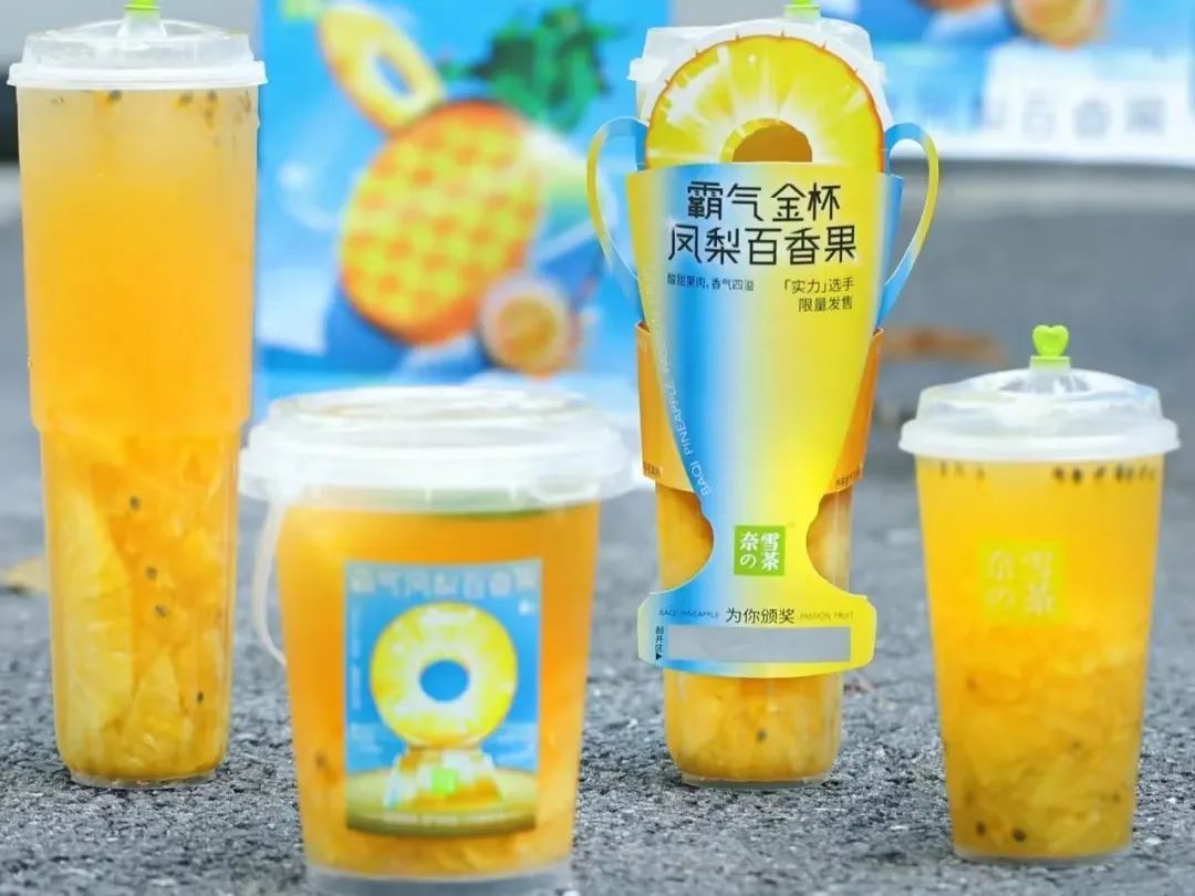 上個(gè)月,奈雪上新了“霸氣一桶鳳梨百香果”,在杯中放置整片鳳梨,加強(qiáng)“料多、劃算”的消費(fèi)認(rèn)知。一起上架的還有超長鳳梨杯“霸氣金杯鳳梨”,25厘米長的杯型,也增加了產(chǎn)品賣點(diǎn)。