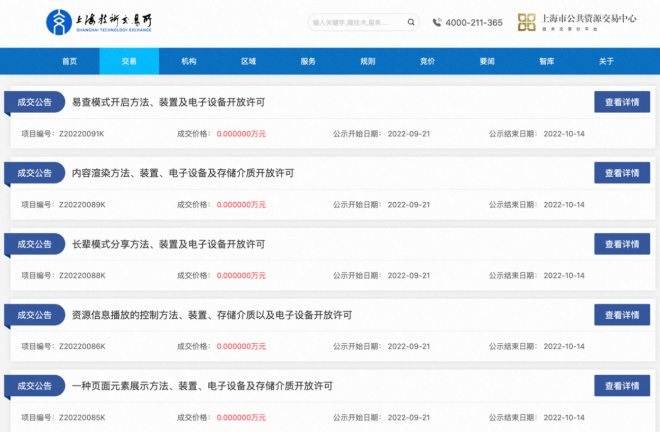 公告顯示相關(guān)開放許可交易價(jià)格均為零元