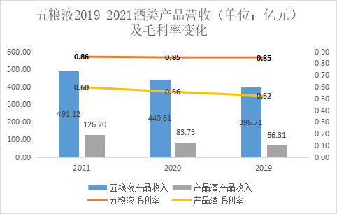 2019-2021年三年中高端的五糧液產(chǎn)品營收收入占比逐年下降,從86%下降到了80%,而五糧液產(chǎn)品的營收增速和毛利率穩(wěn)定在11%和85%左右,而系列酒產(chǎn)品的營收出現(xiàn)了快速增長,2020年、2021年同比增長分別達(dá)到了26%和51%,有著逐漸去高端化的趨勢。