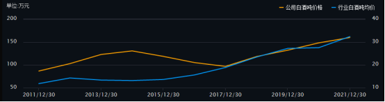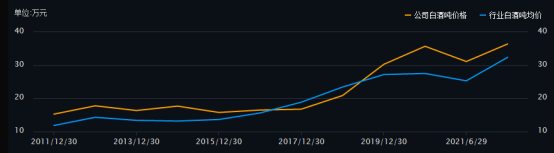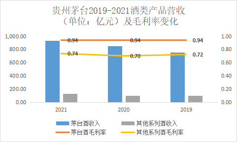 貴州茅臺(tái)年報(bào)中披露,公司酒類產(chǎn)品按檔次可以分為兩大類,分別是高端檔的茅臺(tái)酒和其他系列酒,2019-2021年三年中高端的茅臺(tái)酒收入一直占比接近90%,且毛利率高達(dá)94%,因此造就了貴州茅臺(tái)整體超過90%的超高毛利率。此外,中低端檔次的其他系列酒的也要比五糧液的產(chǎn)品酒毛利率高20個(gè)百分點(diǎn)左右。毫無疑問,貴州茅臺(tái)的品牌溢價(jià)能力遠(yuǎn)高于五糧液。