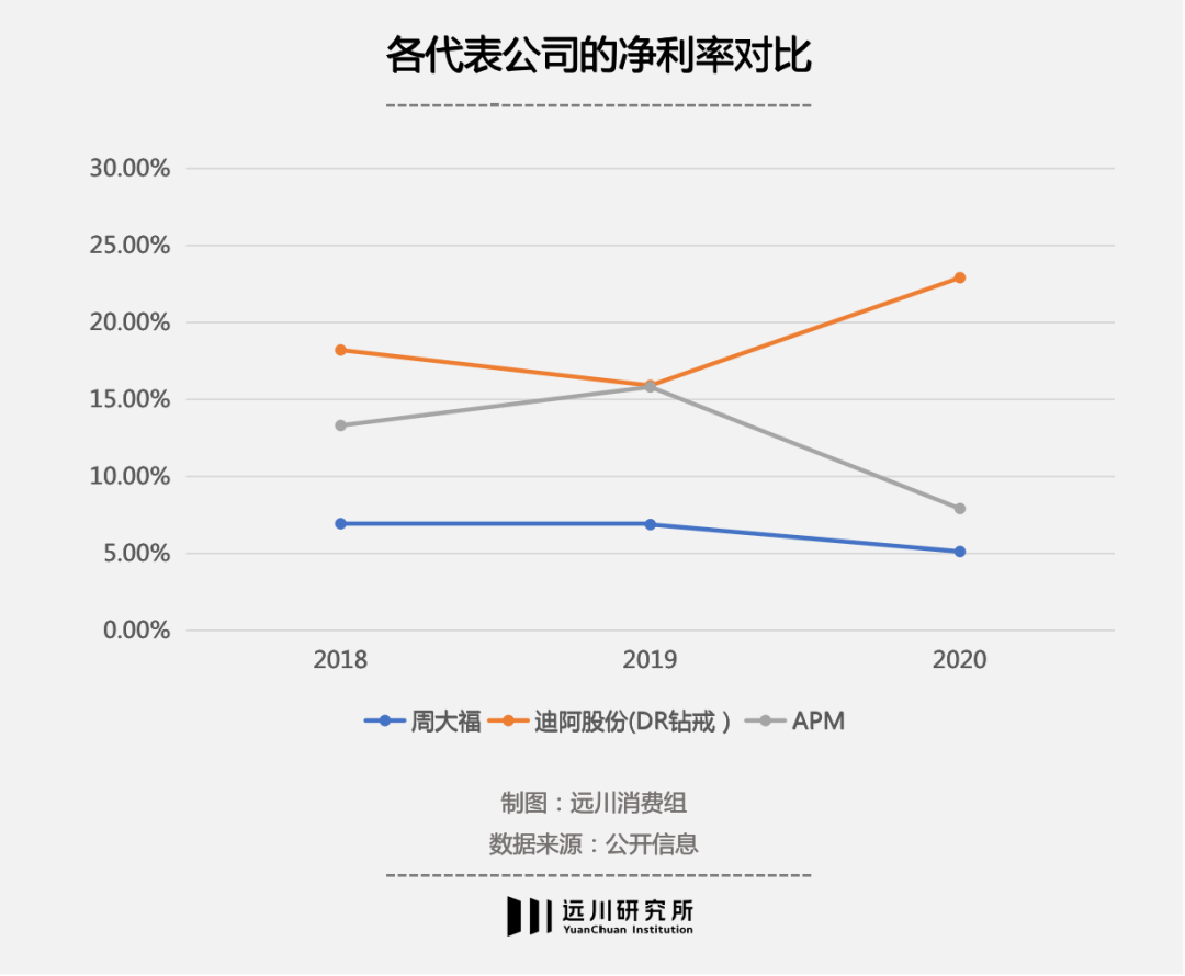 因而,低溢價(jià)、低毛利成了黃金珠寶品牌的共同特征,上游金礦開采行業(yè)平均有50%毛利率,而下游品牌商只有20%左右。