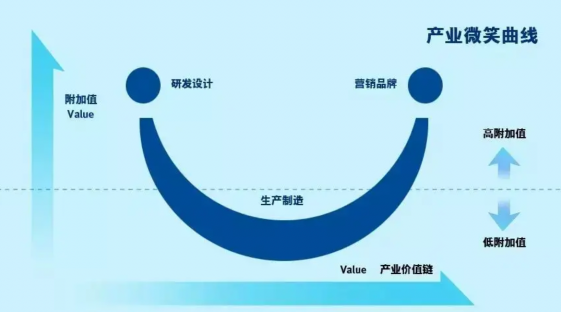 微笑曲線兩端朝上,左邊是研發(fā)設計,右邊是營銷和品牌都屬于高附加值環(huán)節(jié),而對于曲線最底部的是“生產(chǎn)制造”,屬于低附加值環(huán)節(jié)。