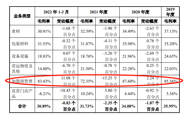 這主要是因為蜜雪走的是加盟經(jīng)營為主的路線,加盟店自負盈虧,公司不用承擔租金以及加盟店人員、水電等開銷。除了為加盟商提供食材、包裝、設備、物流等服務,蜜雪加盟商管理的毛利率是最高的,從2019年到2022年1—3月,維持在72%—87%之間。而直營門店因為要給加盟店“打樣”,租金裝修等成本上升,再加上公司關閉了盈利不好的直營店,因此毛利率大幅下降,今年Q1甚至已經(jīng)為負數(shù)。