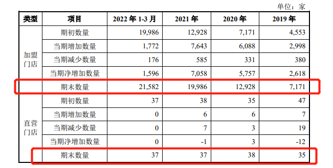 當一家店賺到錢了之后,加盟商就會想擴大店的數(shù)量,甚至進行片區(qū)承包,以此來增加收益。這也進一步推動了蜜雪加盟店的擴張,從2020—2021年期間,蜜雪一年就開了7058家加盟店,平均一天開19家,算下來就是一個半小時開一家,這速度幾乎是瑞幸的三倍了。