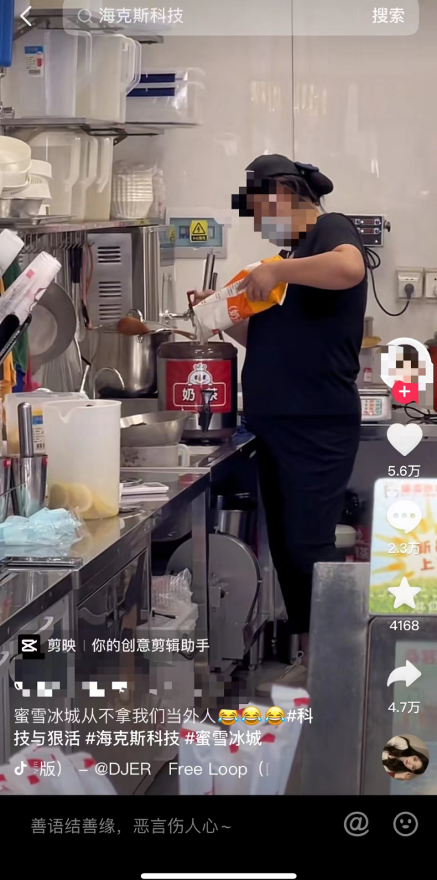 一網(wǎng)友在社交平臺上曬出了自己在蜜雪冰城購買芋圓葡萄的經(jīng)歷,網(wǎng)友問店員奶茶里為什么沒有葡萄,蜜雪冰城店員回答道:“老婆餅里也沒老婆啊”。在看蜜雪冰城案臺上各種濃縮的色素糖漿、果醬、奶茶粉,網(wǎng)友“悟”出了一個道理:既然蜜雪沒嫌棄我窮,自己也不能嫌棄蜜雪滿滿的?怂箍萍肌6〖t書上也有不少筆記吐槽蜜雪冰城的這款產(chǎn)品香精“氣息”明顯。