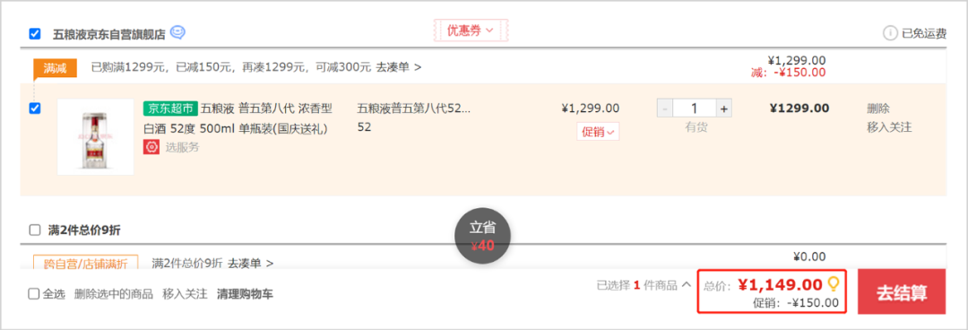 據(jù)五糧液京東自營旗艦店的價格數(shù)據(jù),53度500ml第八代五糧液優(yōu)惠前單價為1299元,優(yōu)惠后到手價為1149元,與指導(dǎo)價1499元的價格相比,倒掛十分明顯。