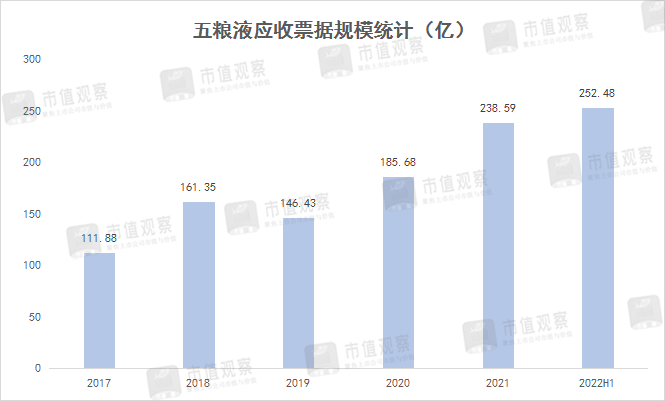 數(shù)據(jù)顯示,近年來五糧液應(yīng)收票據(jù)規(guī)模居高不下,且仍呈現(xiàn)大幅增長狀態(tài)。今年上半年高達252.48億,同比增長38.46%,占營收比重已超過60%。而茅臺該項僅為1.44億,瀘州老窖為16.73億。