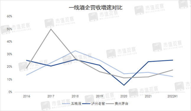 縱觀五糧液財報,2020年之后其業(yè)績便一直處于失速狀態(tài),今年上半年還創(chuàng)下了自2016年行業(yè)復(fù)蘇以來同期增速的新低。并且在當(dāng)前以“茅五瀘”為核心的一線酒企中,五糧液的增長最為遜色。