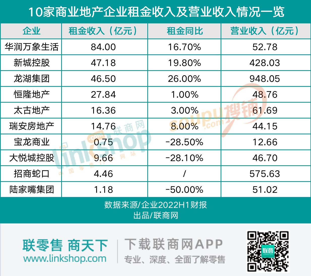 10家重點商業(yè)地產(chǎn)企業(yè)2022年上半年租金收入情況