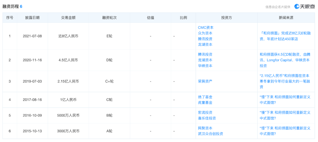 據(jù)天眼查顯示,成立于2012年的和府撈面如今已經(jīng)完成了6次融資。最近一次發(fā)生在2021年7月,其完成了近8億人民幣E輪融資,由CMC資本領(lǐng)投,新股東眾為資本、老股東騰訊投資、Longfor Capital跟投。