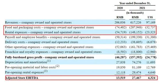 根據(jù)招股書,自營門店層面,食材成本及租金占比均有大幅優(yōu)化。食材成本占比從2019年的44.9%降至2021年的33.7%;租金占比從39.0%降至24.0%。