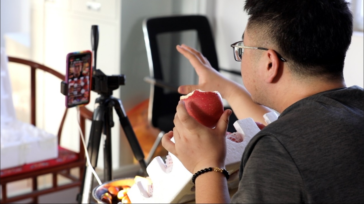 △付佳奇在拼多多直播間介紹煙臺蘋果,收獲了一眾粉絲。薛童/攝