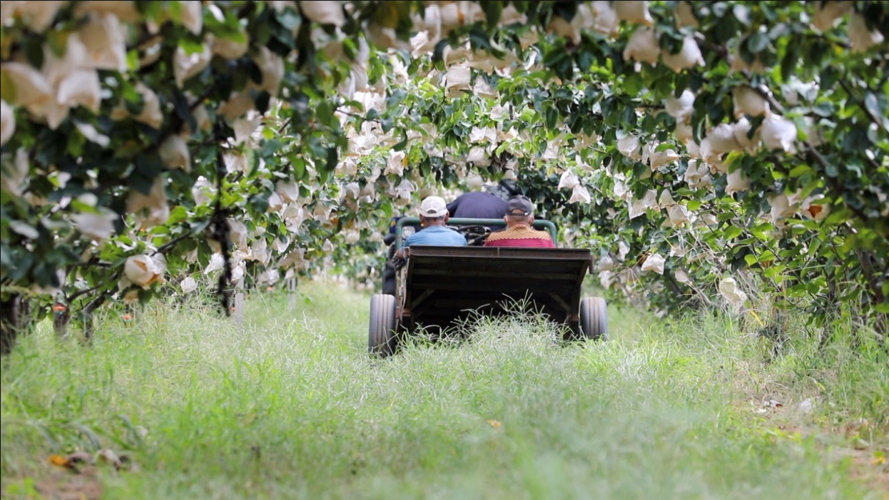姜吉坤介紹,蘋果種植工序較為繁瑣,修剪枝條、疏花、授粉、疏果、套袋、取袋等工序夠忙活一整年,通常一個枝頭上只留兩個果子,這樣才能保障每一個蘋果都能長得好看又好吃。