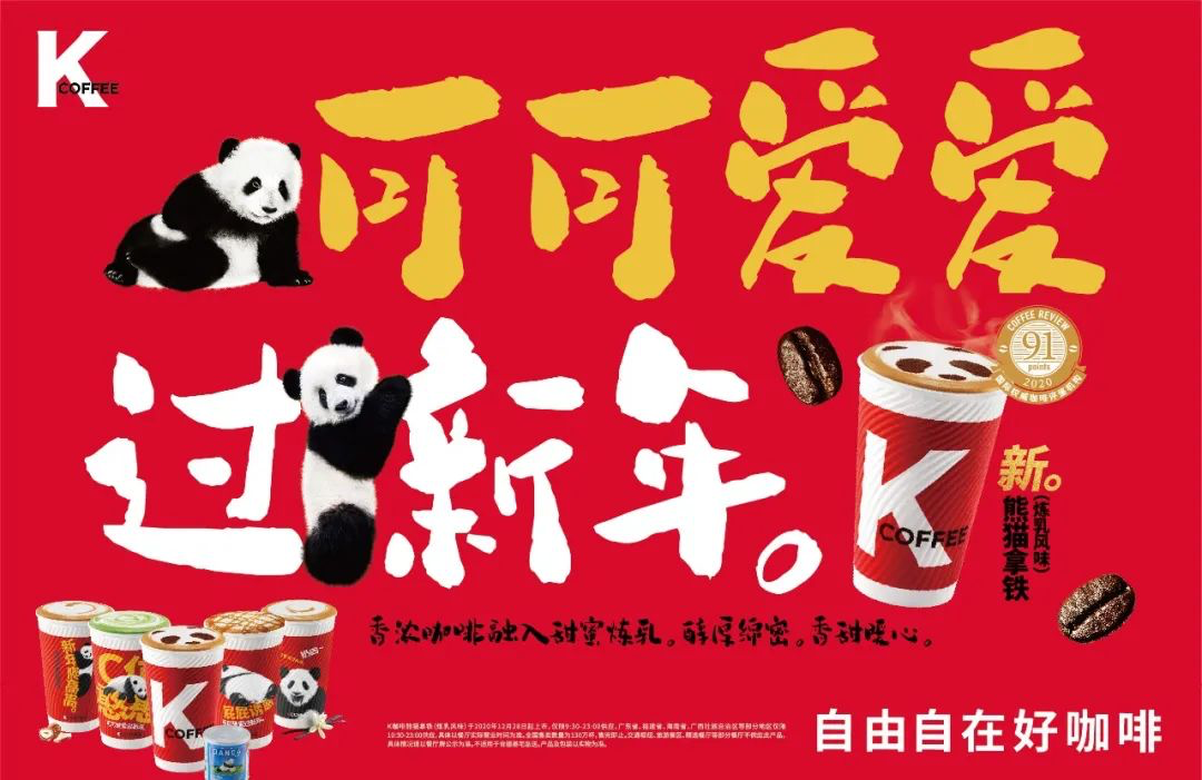 去年KCOFFEE還聯(lián)合全國經(jīng)典品牌“熊貓煉乳”,推出的K咖啡熊貓拿鐵,一度在各大主流平臺掀起打卡潮。不同造型的熊貓杯子圖案,加上可愛的熊貓頭撒粉,一秒戳中了消費者的萌點。