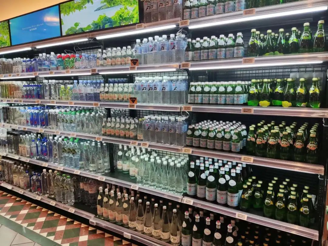 不僅在線上電商平臺,線下商超,高端水更是琳瑯滿目。