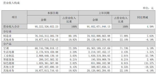 從今年的財(cái)報(bào)來看,過去幾年的“不務(wù)正業(yè)”,并沒有為格力的業(yè)績做出像樣的貢獻(xiàn)。2022年上半年,格力952.20億元的營收中,制造業(yè)占比達(dá)80.18%。單一的空調(diào)類產(chǎn)品就貢獻(xiàn)了72.2%的營收,而生活電器、工業(yè)制品和綠色能源等其他產(chǎn)品累計(jì)占比不到8%。