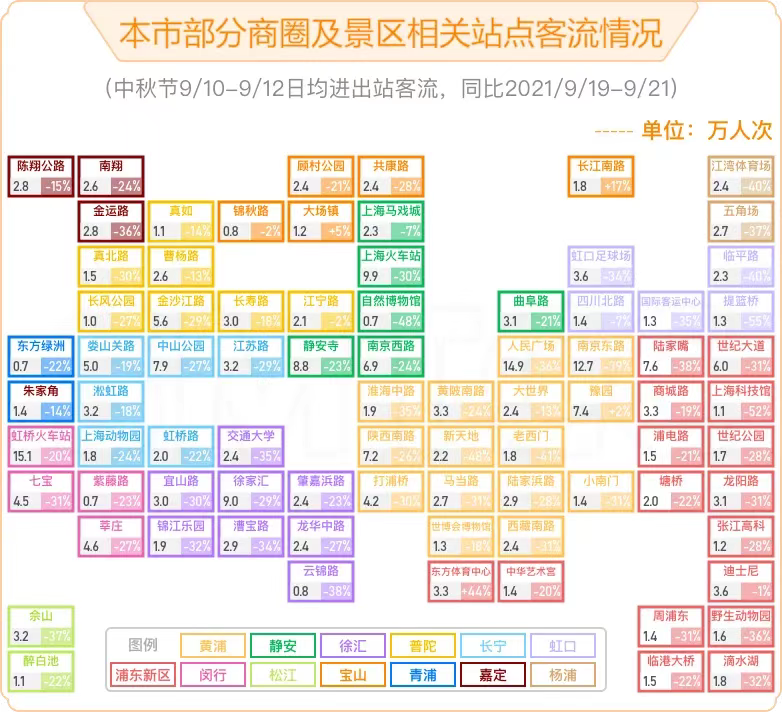 上海商業(yè)正在復(fù)元的,但不得不承認(rèn),還未到樂(lè)觀的程度。以不久前的中秋數(shù)據(jù)來(lái)看,上海中秋期間軌道交通全網(wǎng)日均客流572萬(wàn)人次,較2021年同期下降23.2%。人民廣場(chǎng)、南京東路、陸家嘴等站客流同比下降超30%。主要商圈周邊軌交站點(diǎn),客流同比降幅普遍高于20%。不過(guò),也有逆勢(shì)上漲的,如東方體育中心客流同比大漲44%(前灘太古里去年9月30日開(kāi)業(yè),商圈引入大量新客流)。