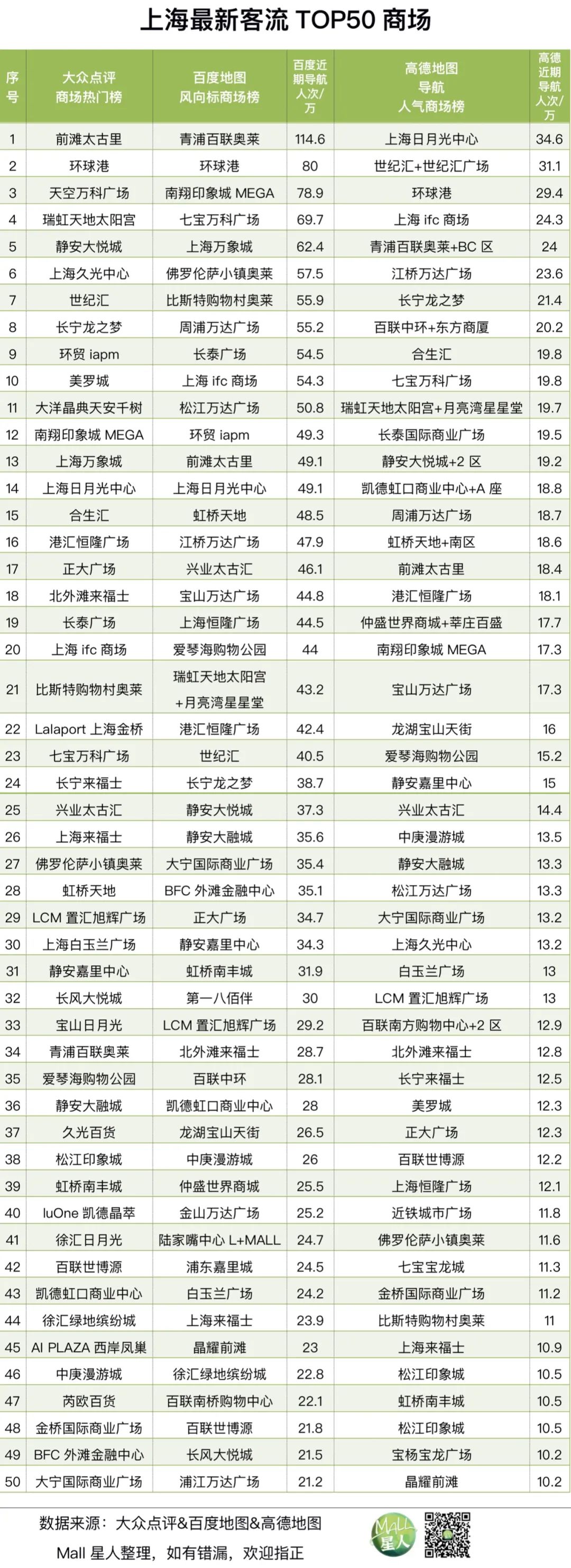 雖然很難拿到或測(cè)算各個(gè)商場(chǎng)的實(shí)時(shí)客流數(shù)據(jù),但我們不妨從大眾點(diǎn)評(píng)、百度地圖和高德地圖三個(gè)數(shù)據(jù)視角來(lái)審視上海最新的客流TOP50商場(chǎng)(詳見(jiàn)下表)。