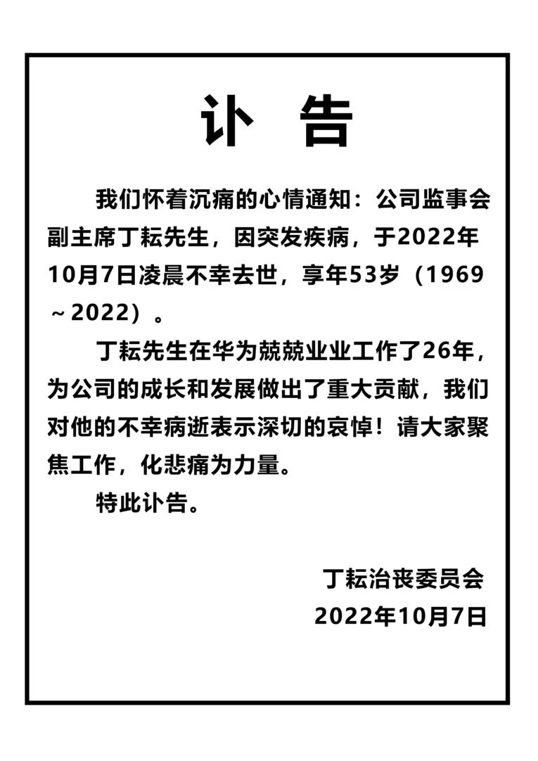 華為方面發(fā)訃告表示,“我們懷著沉痛的心情通知,丁耘因突發(fā)疾病,于2022年10月7日凌晨不幸去世,享年53歲(1969 ~2022)!
