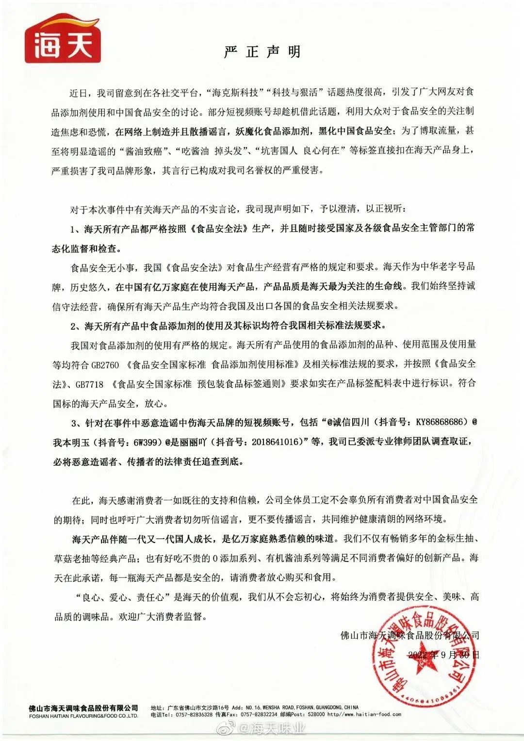 9月30日,海天發(fā)布聲明,稱部分短視頻賬號利用大眾對于食品安全的關(guān)注制造焦慮和恐慌,妖魔化食品添加劑,黑化中國食品安全;為了博取流量,甚至將明顯造謠的“醬油致癌”“吃醬油掉頭發(fā)”“坑害國人良心何在”等標簽直接扣在海天產(chǎn)品身上。