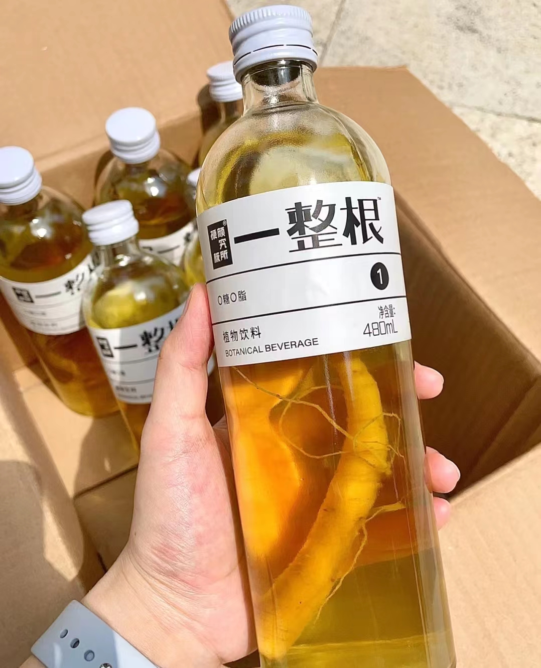 這是一瓶以人參為主原料的植物飲料。一整根人參被清晰可見地放在了既簡約又高檔的玻璃瓶中,并與杭白菊、茉莉花等配料制作而成的淡黃色液體融為一體,不禁讓人聯(lián)想到了“大補(bǔ)”和“養(yǎng)生”。