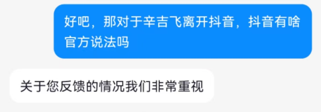 對(duì)于辛吉飛退出抖音,我們聯(lián)系了抖音APP在線客服,對(duì)方并沒(méi)有選擇正面回答此問(wèn)題,一直在翻來(lái)覆去表達(dá)“關(guān)于您反饋的情況我們非常重視”的說(shuō)法。