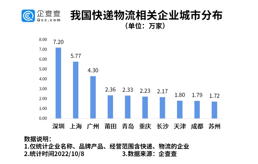 企查查數(shù)據(jù)顯示,從城市分布來看,深圳以7.20萬家快遞物流相關(guān)企業(yè)排名第一。上海、廣州分別有5.77萬家、4.30萬家快遞物流相關(guān)企業(yè),排名前三。此后依次為莆田、青島等。