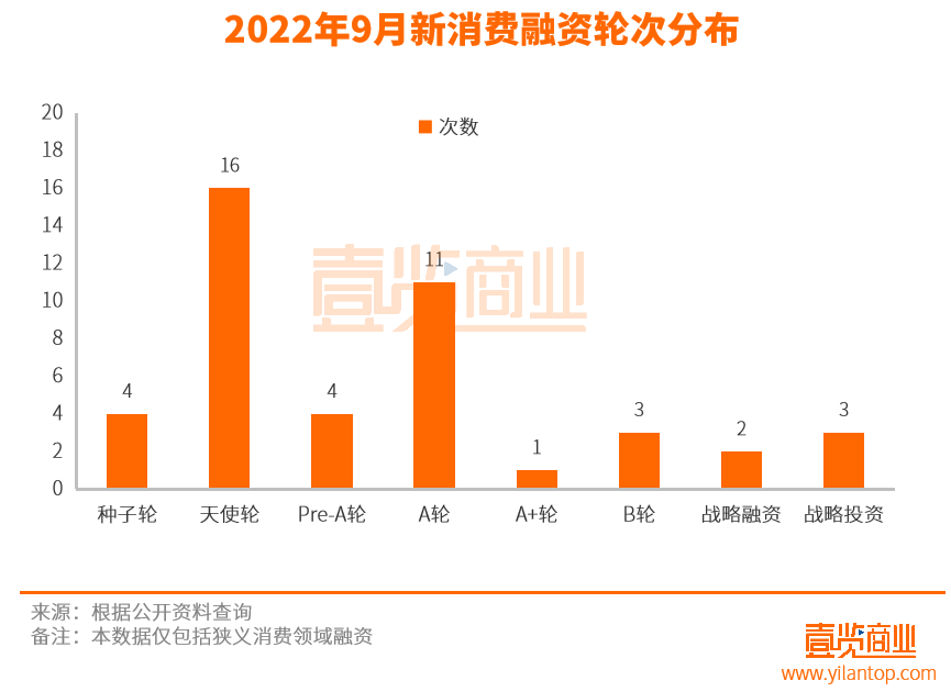 從融資輪次來看,9月份的新消費融資主要集中在天使輪,一共發(fā)生16起,占比為36.36%。其次是A輪,融資11次,占比為25%。新消費賽道融資仍然主要處于早期階段。