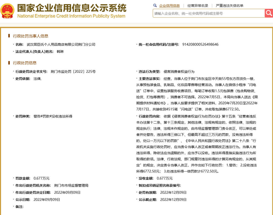 據(jù)國(guó)家企業(yè)信用信息公示系統(tǒng)顯示的處罰決定書,武漢屈臣氏個(gè)人用品商店有限公司荊門分公司(下稱:屈臣氏荊門分公司)在微信小程序“閃電送”訂單中,設(shè)置包裝服務(wù)收費(fèi)項(xiàng)目,每筆訂單收取1.5元包裝費(fèi),消費(fèi)者不可選擇。資料顯示,2020年7月20日至2022年7月17日,屈臣氏荊門分公司共接收到4515筆“閃電送”訂單,共收取包裝費(fèi)6772.50元。