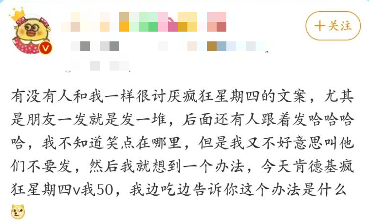 每隔一段時間,跟肯德基瘋狂星期四有關的梗和段子,就會收割一波關注度,真是百讀不厭,常讀常新。