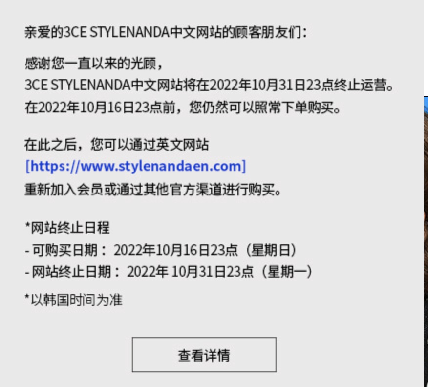 根據(jù)品牌官方網(wǎng)站公告,3CE Stylenanda中文網(wǎng)站將在10月31日23點(diǎn)終止運(yùn)營(yíng),顧客在10月16日23點(diǎn)前可以下單購(gòu)買(mǎi),此后可在中文網(wǎng)站或者其他官方渠道購(gòu)買(mǎi)。