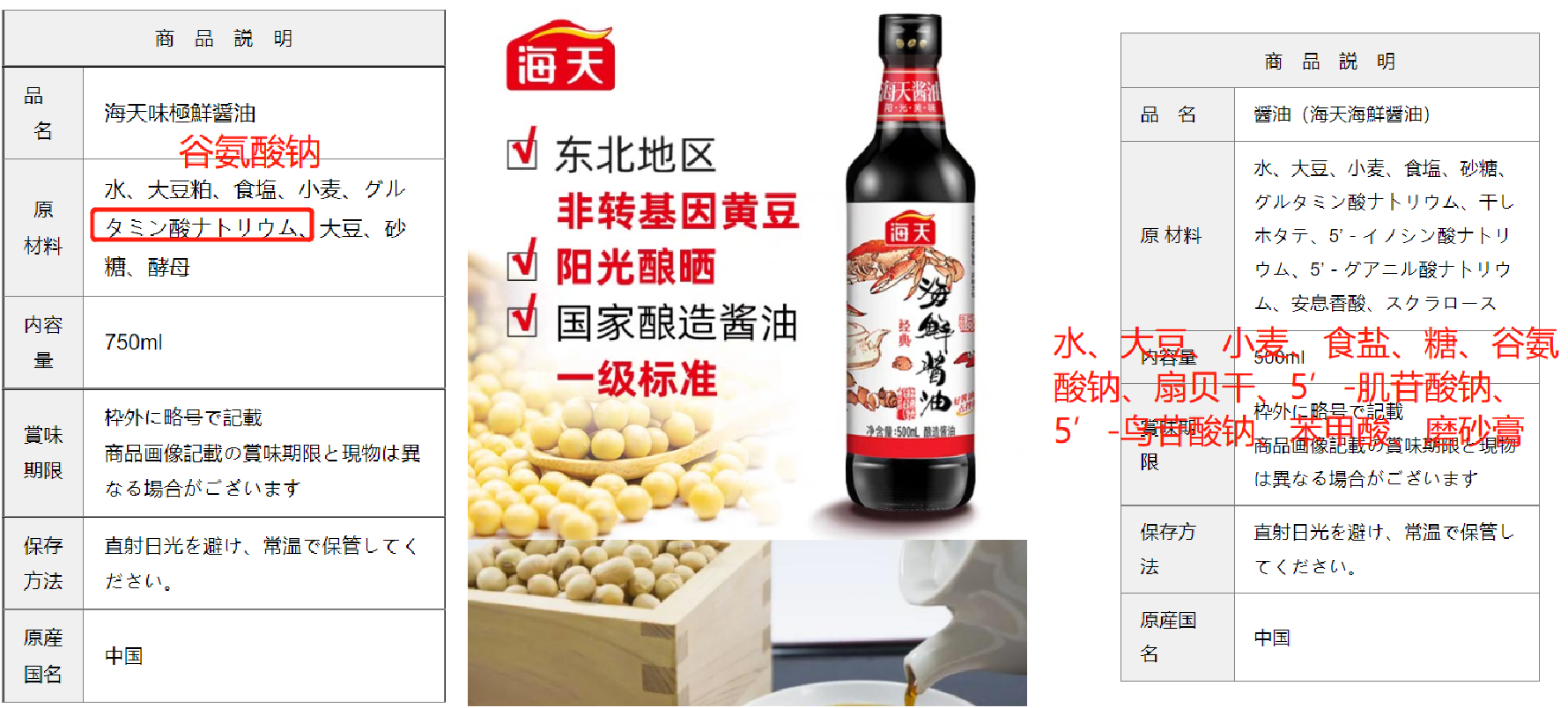 事實上,日本也存在有添加產(chǎn)品。比如在日本主流的購物平臺,就能夠看到同樣添加了谷氨酸鈉(一種味精)的味極鮮醬油;日本的海天海鮮醬油添加劑則更多。