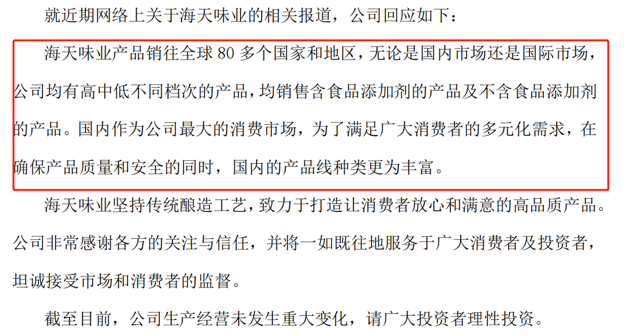 海天味業(yè)在昨晚發(fā)的公告也澄清了這一點,公告指出:“無論是國內市場還是國際市場,公司(海天味業(yè))均有高中低不同檔次的產(chǎn)品,均銷售含食品添加劑的產(chǎn)品及不含食品添加劑的產(chǎn)品!