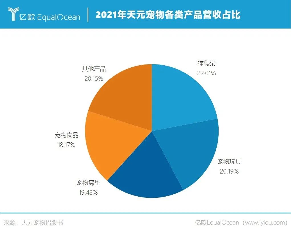 貓爬架和寵物玩具和是天元寵物的主要產(chǎn)品,收入加起來(lái)占到總營(yíng)收的近半壁江山。以2021年為例,其第一大品類貓爬架占主營(yíng)收入的22.01%,其次為寵物玩具占20.19%,寵物窩墊和寵物食品的占比分別在19.48%和18.17%。