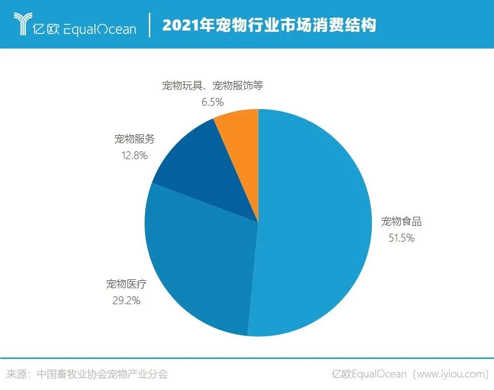 中國(guó)畜牧業(yè)協(xié)會(huì)寵物產(chǎn)業(yè)分會(huì)數(shù)據(jù)顯示,2021年寵物行業(yè)市場(chǎng)消費(fèi)結(jié)構(gòu)中,寵物食品產(chǎn)業(yè)占市場(chǎng)的51.5%,寵物醫(yī)療產(chǎn)業(yè)占市場(chǎng)的29.2%,服務(wù)產(chǎn)業(yè)包括寵物寄養(yǎng)、寵物美容、寵物婚喪等占據(jù)市場(chǎng)的12.8%,另外還有寵物玩具、寵物服飾等領(lǐng)域占據(jù)6.5%。