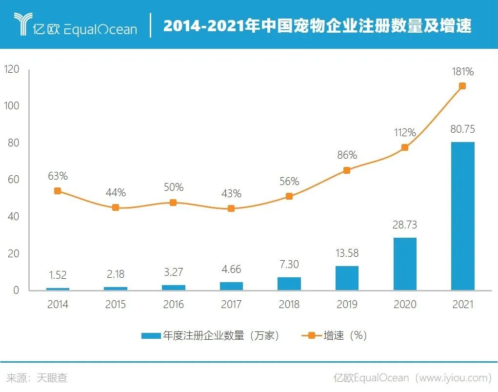 多家寵物公司都是在這期間成立,比如中寵股份成立于1998年,佩蒂股份成立于2002年。天眼查數(shù)據(jù)顯示,2000年是中國(guó)寵物企業(yè)注冊(cè)的元年,當(dāng)年有761家公司名稱或經(jīng)營(yíng)范圍中包含“寵物”的企業(yè)成立;近年來(lái)寵物企業(yè)注冊(cè)量逐年上漲,2014年新增企業(yè)注冊(cè)數(shù)量超過1萬(wàn)家,2021年新增注冊(cè)企業(yè)數(shù)量超過80萬(wàn)家。