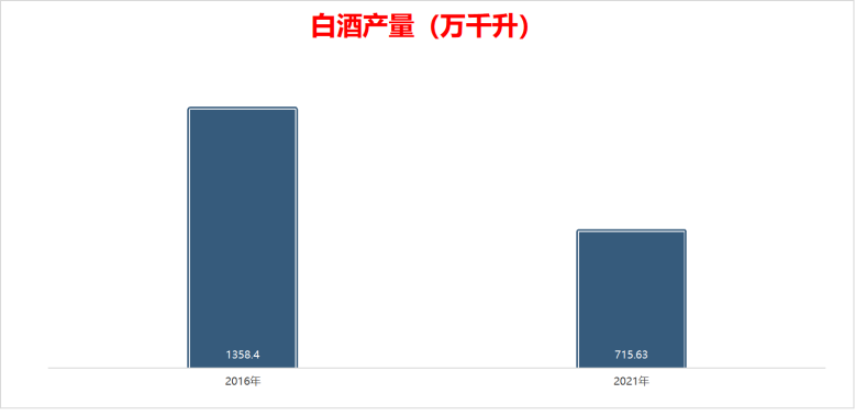 據(jù)國家統(tǒng)計(jì)局的數(shù)據(jù)顯示,2021年中國白酒行業(yè)規(guī)模以上企業(yè)合計(jì)產(chǎn)量為715.63萬千升,比2020年減少了25.07萬千升,已連續(xù)五年萎縮,相比2016年整體萎縮了47.32%。