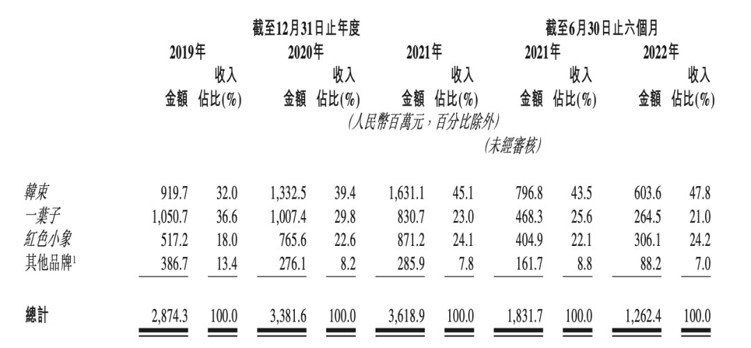 報(bào)告期內(nèi),韓束、一葉子、紅色小象三大品牌合計(jì)為上美集團(tuán)貢獻(xiàn)86.6%、91.8%、92.2%及93.0%的收入。其中,2021年,韓束實(shí)現(xiàn)收入16.31億元,在上美集團(tuán)總收入中的占比達(dá)45.1%。