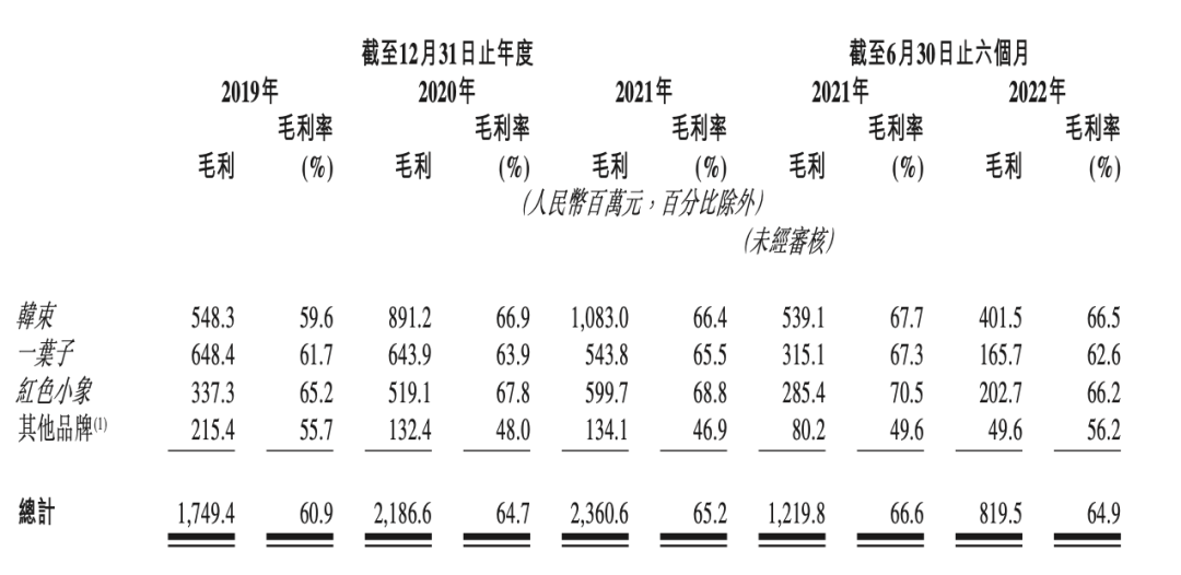 從收入來看,韓束為主力品牌,一葉子近年增長(zhǎng)乏力、收入占比下滑。2019-2021年及2022上半年,一葉子占營(yíng)業(yè)額的比例分別為36.6%、29.8%、23%和21%。