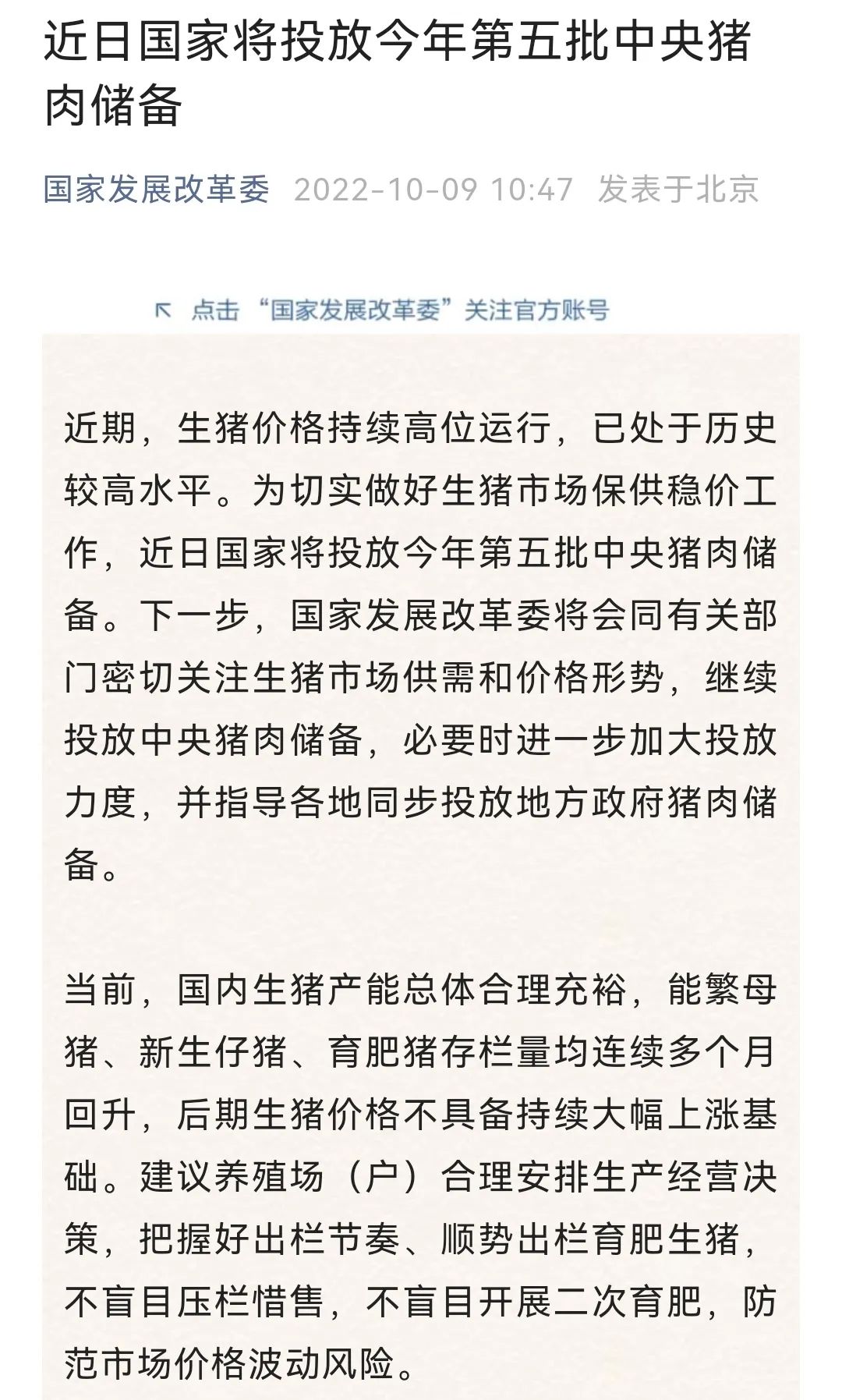 10月9日,國家發(fā)展改革委微信公眾號發(fā)布消息稱,近期,生豬價格持續(xù)高位運行,已處于歷史較高水平。為切實做好生豬市場保供穩(wěn)價工作,近日國家將投放今年第五批中央豬肉儲備。