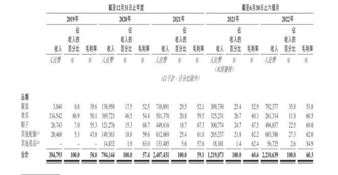 蕉下服裝品類成為主要收入來(lái)源,在2019年、2020年、2021年分別錄的收入304萬(wàn)元、1.39億元、7.11億元,分別占收入比例的0.8%、17.5%、29.5%。2022年上半年,服裝品類收入超7.92億元,占比達(dá)到35.8%,同比增長(zhǎng)155.8%。